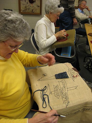 Joyce showing her acorn pad. Ann always brings jokes along for our entertainment. I think she's contemplating which one to tell first.